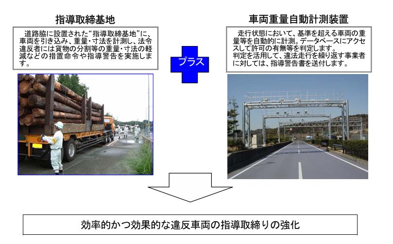 指導取締基地における指導取締りが定期的に実施されているのにプラスして新たに指導取締りを効率的かつ効果的に行えるよう、新たに整備した車両重量自動計測装置の運用が開始しされこれまでの指導取締基地での指導取締りとあわせて、違反車両の指導取締りを強化が図られています。